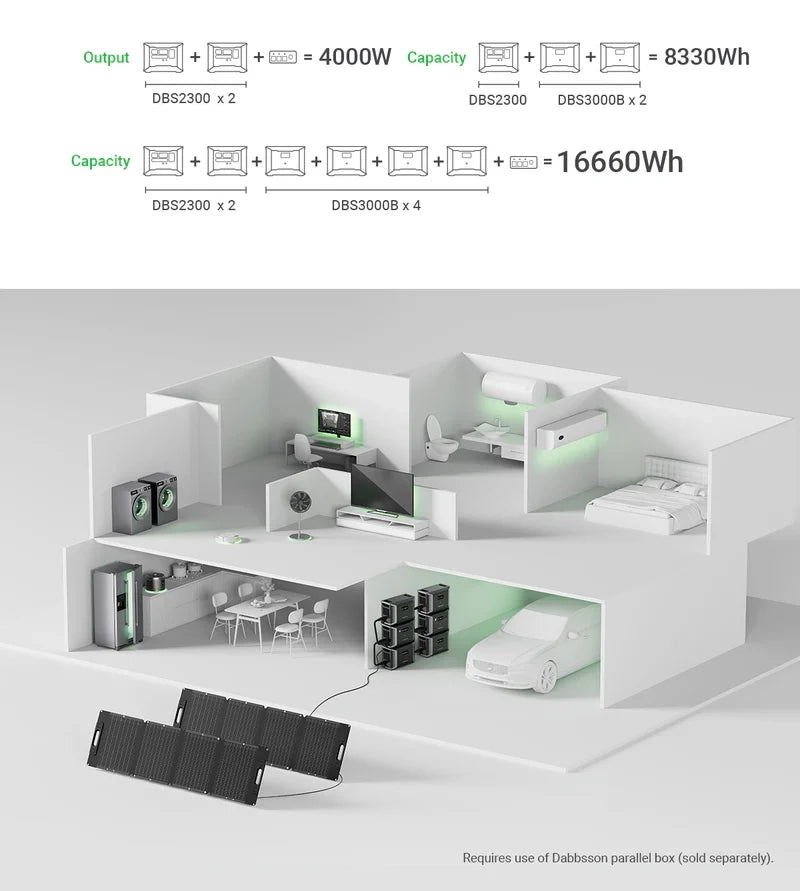 З’єднайте два блоки разом, щоб отримати потужну потужність 4000 Вт разом із чотирма акумуляторними блоками з максимальною ємністю 16660 Вт-год.